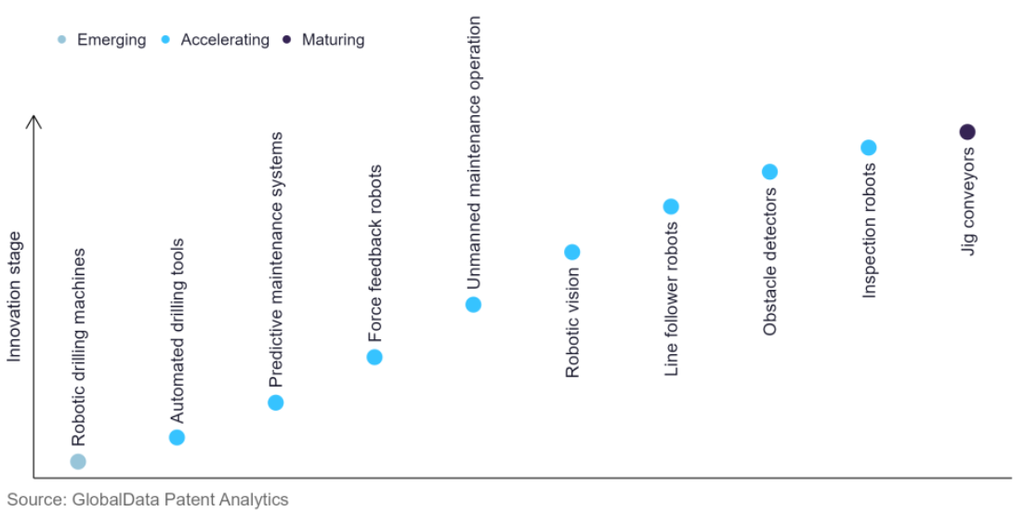Within the emerging innovation stage, robotic drilling machines is a disruptive technology that is in the early stages of application and should be tracked closely. Automated drilling tools, predictive maintenance systems, and force feedback robots are some of the accelerating innovation areas, where adoption has been steadily increasing. Among maturing innovation areas is jig conveyors, which is now well established in the industry.